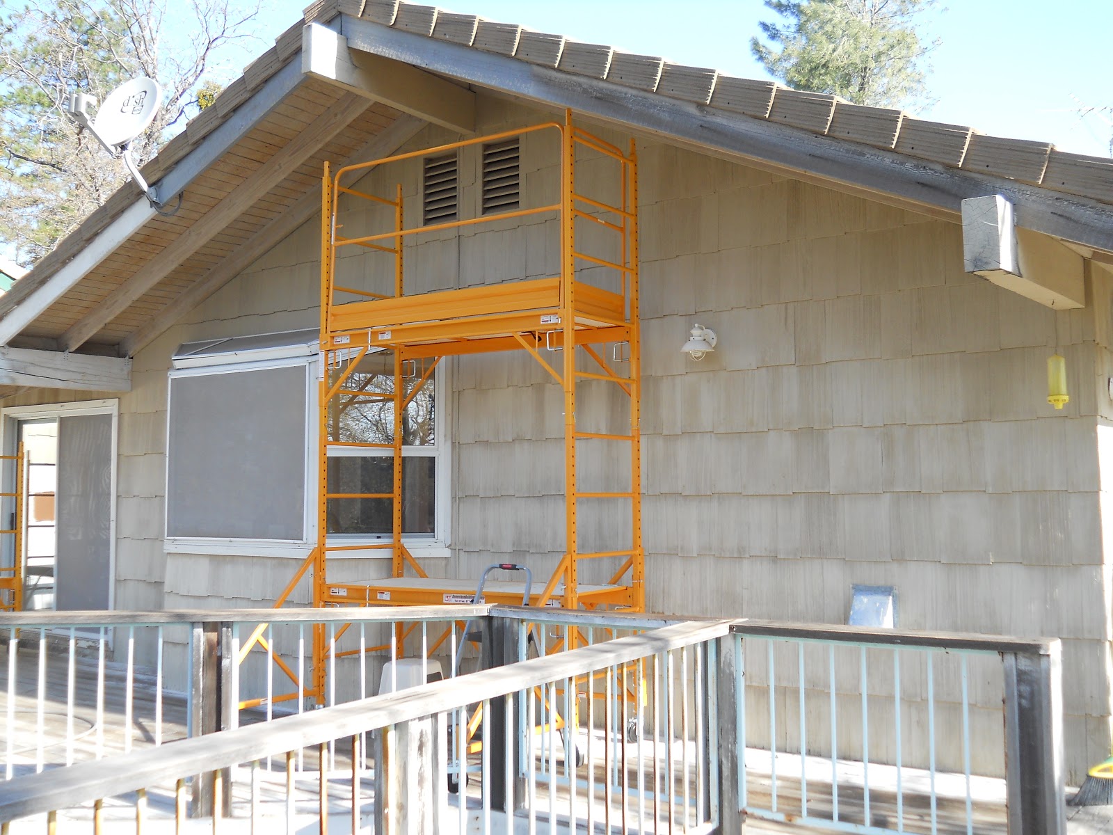 We are ready to paint. Hubby and I brought the scaffolding to the side of the house from the garage. We have to assemble the upper section so I will be able to reach the highest overhang ( I do not know what you call it but it is the under part of the roof) I have to prime it first maybe 2 coats and the top coat. We also add one railing. I have a slight fear of heights and let me tell you, if I look down my knees tremble and feel sick in my stomach.
